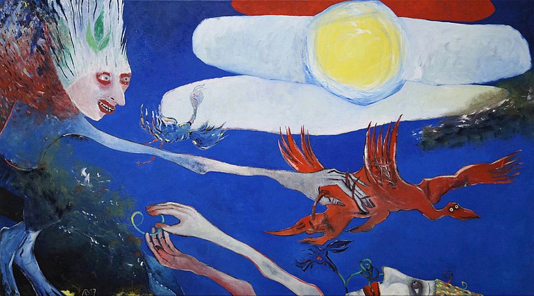 Auf der Bildfläche begegnen sich Menschen, Tiere und Mischwesen, die eine seelisch-geistige Dimension des Menschseins abbilden – aus philosophischer und psychologischer Perspektive, aber auch im sozialen Miteinander und Gegeneinander.
